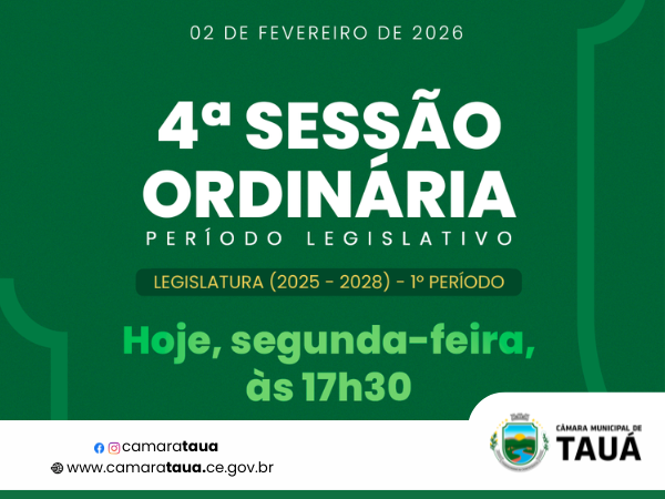 Hoje, segunda-feira (02), às 17h30, será realizada a 4ª Sessão Ordinária, do primeiro período legislativo de 2026.