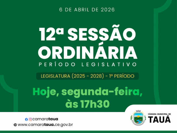 Hoje, segunda-feira (6), às 17h30, será realizada a 12ª Sessão Ordinária, do primeiro período legislativo de 2026.